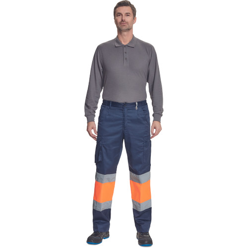 • férfi munkanadrág 7 cm széles fényvisszavető csíkokkal és Hi-Vis elemekkel • 2 első zseb + 1 érmezseb • 2 oldalzseb • 2 hátsó zseb • rugalmas oldalsó betétek a derékpánton • leengedhető szárak