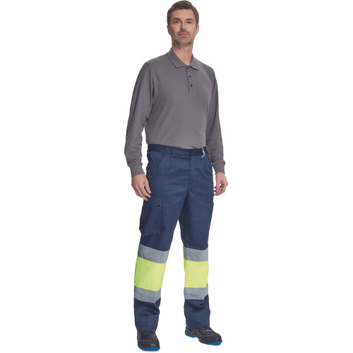 • férfi munkanadrág 7 cm széles fényvisszavető csíkokkal és Hi-Vis elemekkel • 2 első zseb + 1 érmezseb • 2 oldalzseb • 2 hátsó zseb • rugalmas oldalsó betétek a derékpánton • leengedhető szárak