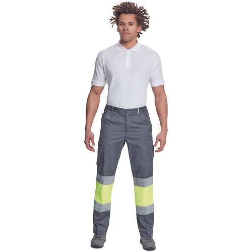 • férfi munkanadrág 7 cm széles fényvisszavető csíkokkal és Hi-Vis elemekkel • 2 első zseb + 1 érmezseb • 2 oldalzseb • 2 hátsó zseb • rugalmas oldalsó betétek a derékpánton • leengedhető szárak