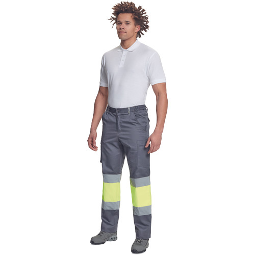 • férfi munkanadrág 7 cm széles fényvisszavető csíkokkal és Hi-Vis elemekkel • 2 első zseb + 1 érmezseb • 2 oldalzseb • 2 hátsó zseb • rugalmas oldalsó betétek a derékpánton • leengedhető szárak