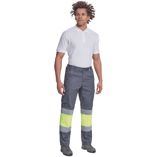 • férfi munkanadrág 7 cm széles fényvisszavető csíkokkal és Hi-Vis elemekkel • 2 első zseb + 1 érmezseb • 2 oldalzseb • 2 hátsó zseb • rugalmas oldalsó betétek a derékpánton • leengedhető szárak