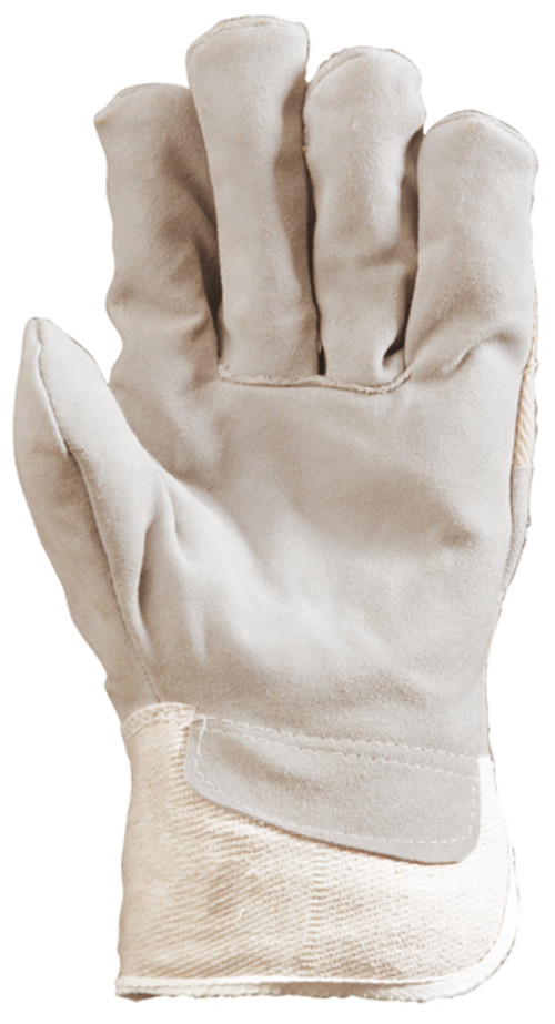 Szürke marhahasíték rakodó kesztyűFehér vászon tenyér, kézhát és mandzsetta7,5cm-es biztonsági mandzsetta