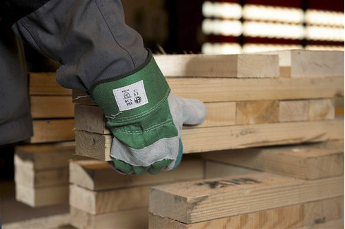 Marhahasíték rakodó kesztyű, zöld hasítékbőr megerősítéssel a tenyéren, a hüvelyk- és mutató ujjon.Pamut béléssel, zöld vászonnal a mandzsettán és a kézháton. 7,5cm-es biztonsági mandzsettával