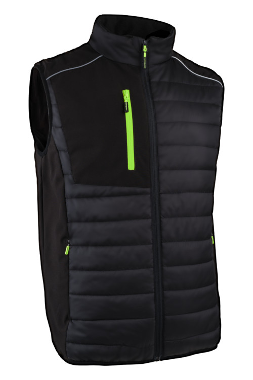Külső: 100% nejlon mikro-ripstop + bélés: 100% poliészter Sorona technológiával -100 g/m2 + 3 rétegű softshell Polár álló gallérÁllig érő cipzár + állvédő 1 cipzáras softshell mellzseb, 2 függőleges oldalzseb + rejtett cipzárok a varrásban 1 tépőzáras belső zseb Gumírozott aljrész Softshell betétes váll-, mell-, oldalrészek és zsebek Hosszított hátrész Vállakon fényvisszaverő díszcsík