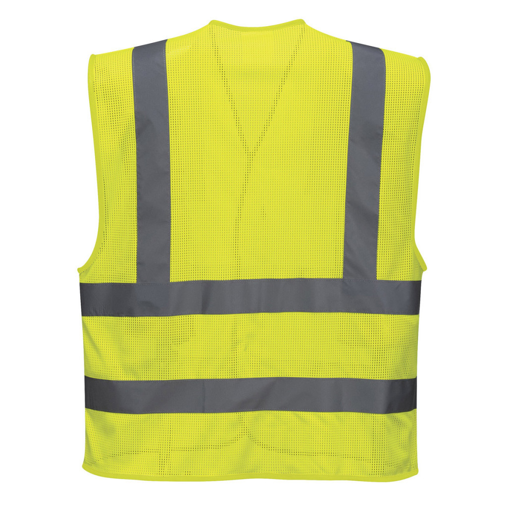 A MeshAir mellény betétekkel jól láthatósági mellény lélegző hálós szövettel, mely frissítő légáramlást biztosít. Tépőzáras záródás jellemzi. Az anyag: MeshAir Hi-Vis 150g. Fontos megjegyezni, hogy nem vegytisztítható.