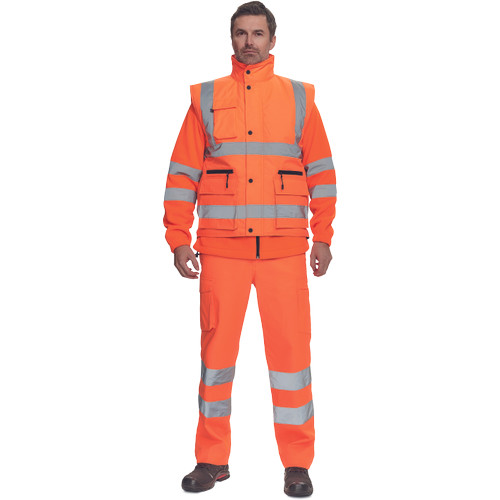 • Hi-Vis bélelt férfi mellény, gallérba rejthető kapucnival • 5 cm széles fényvisszavető csíkok • cipzáras, patentos hajtókával • telefonzseb • 2 nagy első zseb hajtókával, és két cipzáras zseb