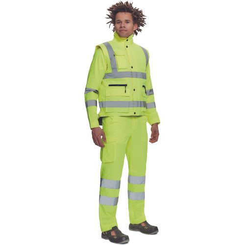 • Hi-Vis bélelt férfi mellény, gallérba rejthető kapucnival • 5 cm széles fényvisszavető csíkok • cipzáras, patentos hajtókával • telefonzseb • 2 nagy első zseb hajtókával, és két cipzáras zseb