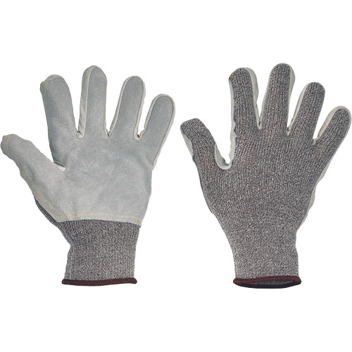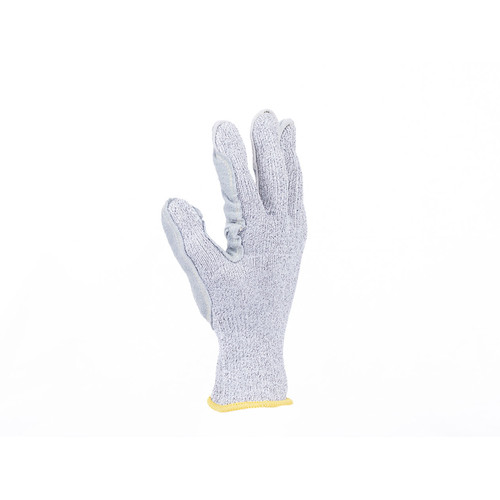 • kötött, varratmentes védőkesztyű E szintű vágásvédelemmel, módosított üvegszál, spandex és nylon felhasználásával, marhabőrrel erősített tenyérrel és ujjakkal•