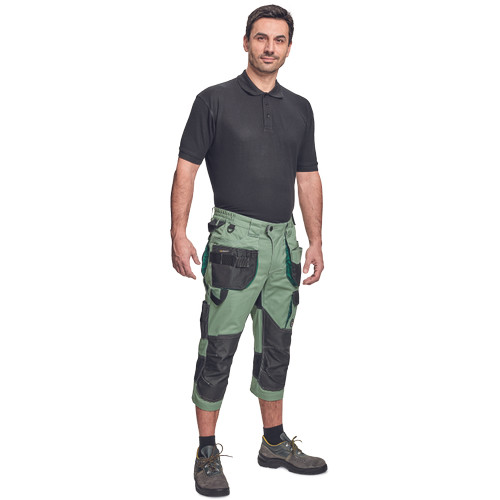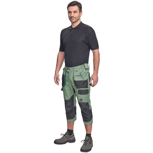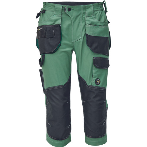 Dinamikus vonalvezetésű, modern szabású férfi 3/4-es nadrág, rugalmas, innovatív TRIFIBETEX® anyagból. Alacsony, gumírozott derékkal készül, láb- és üleprészen tartós, tripla varrásokkal. Praktikus kialakítás: tágas, multifunkcionális első zsebek szerszámtartó pánttal, 2 hátsó zseb Oxford erősítéssel, a combon telefontartó zseb tépőzáras zsebfedővel, külön zsebek vonalzónak, késnek, kalapácsnak, egyedi repülőzseb, D-gyűrű, és szerszámtartó hurok a derékpánton. A munkaruha színeivel harmonizáló fényvisszavető elemekkel egészítettük ki.Anyagösszetétel: 62% pamut, 35% poliészter, 3% elasztán • 260 g/m2