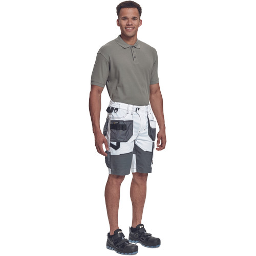 • férfi munka rövidnadrág rugalmas Trifibetex® anyagból • ergonomikus szabás • alacsony, gumírozott derék • tartós tripla varrás a szárakon és az üleprészen • tágas multifunkcionális első zsebek szerszámtartó pánttal • 2 hátsó zseb Oxford erősítéssel • a száron telefontartó zseb tépőzáras zsebfedővel • külön zsebek vonalzónak, késnek, kalapácsnak • egyedi kivitelű repülőzseb • D-gyűrű • szerszámtartó hurok a derékpánton • fényvisszavető részletek