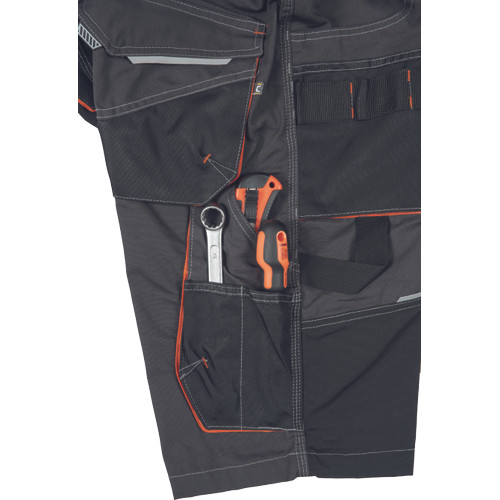 • férfi rövidnadrág tágas zsebekkel • 2 szerszámtartó hurok • Oxford 600D erősítés az igénybevett részeken • tartós hármas varrás • rugalmas derék, fényvisszavető elemek • az erősítéseken kontrasztos színű varratokkal
