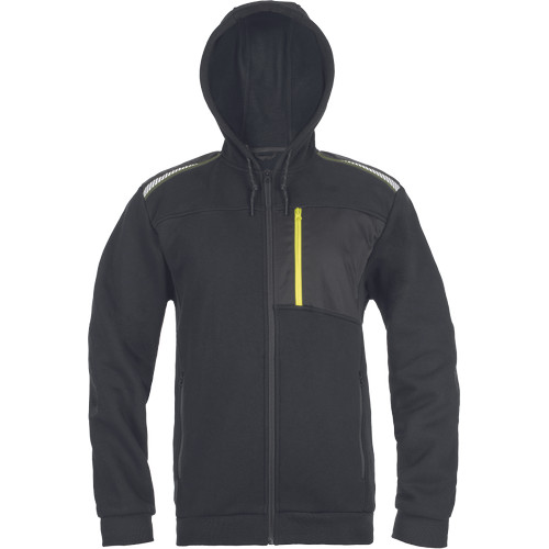 • férfi cipzáras kapucnis kardigán • 2 oldalzseb • 1 mellzseb cipzárral • megerősített vállrészek fényvisszavető csíkokkal • rugalmas derékpánt és mandzsetta