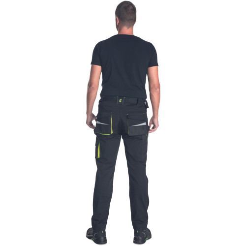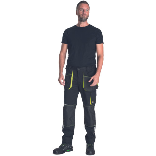 • férfi munkanadrág, rendkívül tartós rugalmas anyagból • elasztikus derékkal • multifunkcionális zsebek • Oxford 600D megerősített térdzsebek térdvédők behelyezéséhez • nyomtatott szegmensekre bontott fényvisszavető részletek • állítható szárhossz