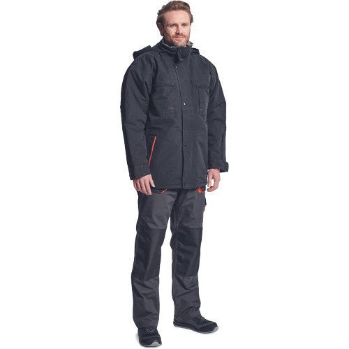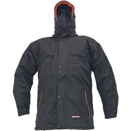 • vízálló télikabát bővített szabással, erős szövetből • levehető, bélelt kapucnival • állítható, tépőzáras mandzsetta • gumírozott alsó szegély • alkalmas fagypont alatti hőmérsékleten is • hímezhető