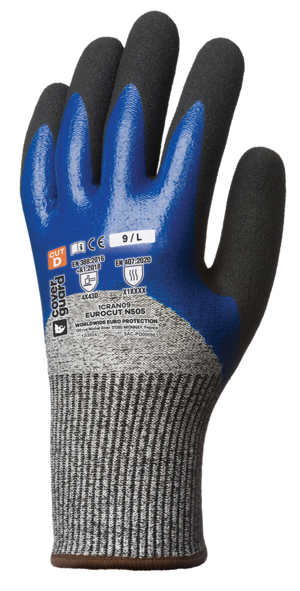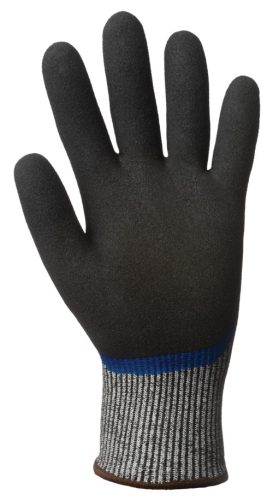 * 13-as kötésű, szürke, varrásmentes, vágásbiztos, HPPE, polianid és elasztán alapanyagú védőkesztyű* ökölcsontig kék sima nitril mártás + a tenyerén fekete speciális Sandy csúszásbiztos nitril réteg* ergonómikus kialakítás* kötött mandzsetta