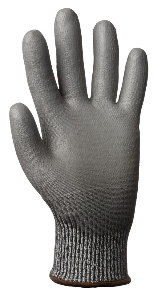Pettyezett szürke kesztyű HDPE-ből, ásványi szálakból, poliamid és elasztánból 13-mas kötésűSzürke poliuretánnal mártott tenyérFonott mandzsetta