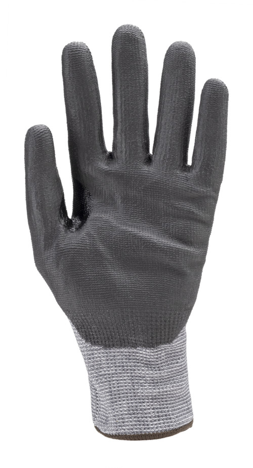 Szürke, HDPE-vel erősített kesztyűTenyerén fekete kopásálló PU mártásNitril megerősítés a mutató- és hüvelykujj közöttMinősítéssel OEKO-TEX® STANDARD 100, CQ 1301/1, IFTH