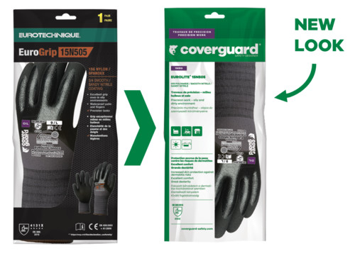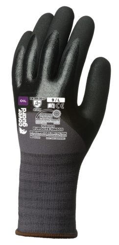 Szürke, varrás nélküli, poliamiddal erősített kesztyű, 15-ös kötésű, kötött mandzsettával.Duplán mártott ökölcsontig: Egy réteg sima egy réteg érdesített nitril.OEKO-TEX® STANDARD 100 minősítés, CQ 1301/1, IFTH vagy 15.HCN.70502, HOHENSTEIN