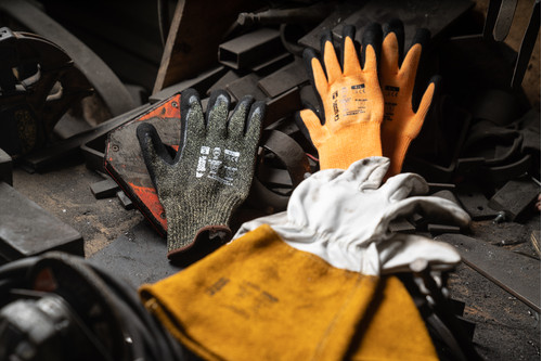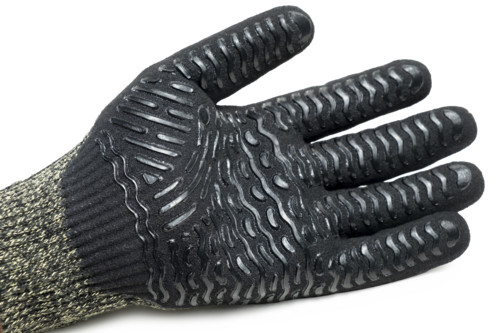 EUROHEAT CUT F 10-es kötésű, varrás nélküli sárga és fekete foltos kötött védőkesztyű, poli-pamut és aramid alapanyagból. Dupla rétegű mártás a tenyéren: sima nitril és sandy csúszásbiztos felülettel, illetve hullámmintás PVC pettyezéssel.