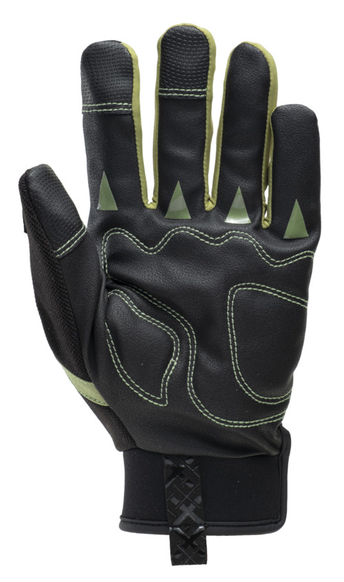 EUROLITE MX200 védőkesztyű, fekete PU tenyérrel, kézhát fekete poliamidból, olajzöld Oxford és fekete mikroszálas anyagbólA hüvelykujj, mutató és a középső ujj vége PU alapanyagú érintőképernyőhöz alkalmazhatóTépőzáras neoprén mandzsetta.