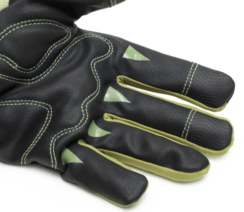 EUROLITE MX200 védőkesztyű, fekete PU tenyérrel, kézhát fekete poliamidból, olajzöld Oxford és fekete mikroszálas anyagbólA hüvelykujj, mutató és a középső ujj vége PU alapanyagú érintőképernyőhöz alkalmazhatóTépőzáras neoprén mandzsetta.