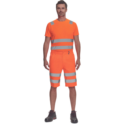 • férfi Hi-Vis rövidnadrág 7 cm széles fényvisszavető csíkokkal • 2 oldalsó zseb + 1 érmezseb • 2 hátsó zseb • rugalmas oldalsó betétek a derékon