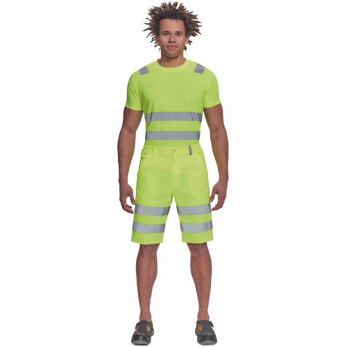 • férfi Hi-Vis rövidnadrág 7 cm széles fényvisszavető csíkokkal • 2 oldalsó zseb + 1 érmezseb • 2 hátsó zseb • rugalmas oldalsó betétek a derékon
