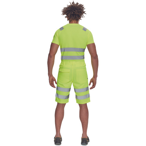 • férfi Hi-Vis rövidnadrág 7 cm széles fényvisszavető csíkokkal • 2 oldalsó zseb + 1 érmezseb • 2 hátsó zseb • rugalmas oldalsó betétek a derékon