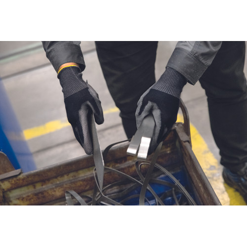 • spandex/üvegszál/nylon felhasználásával készült védőkesztyű • C szintű vágásvédelem • PU mártott tenyér és ujjak • rugalmas mandzsetta