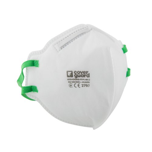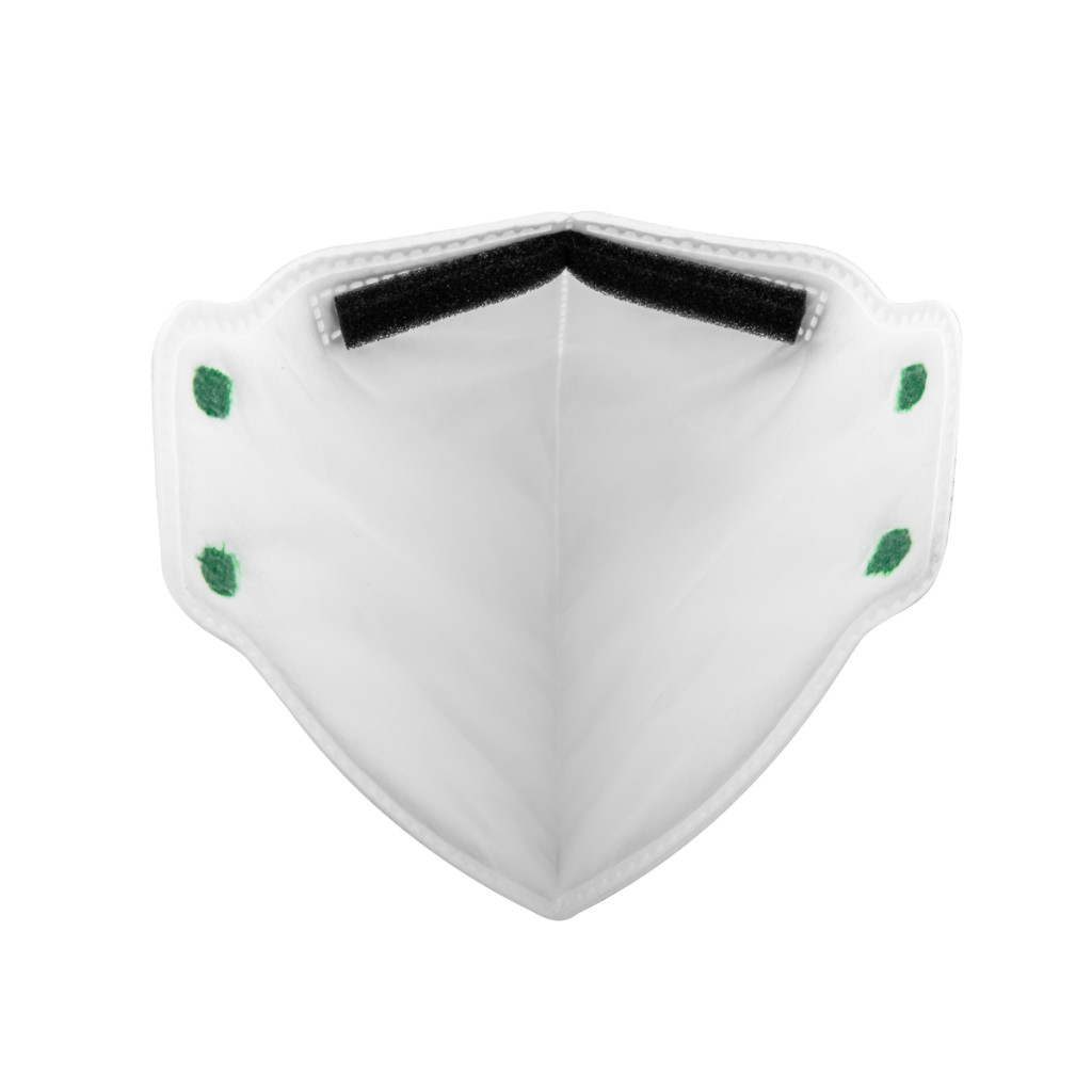 Egyszer használatos, függőlegesen összehajtható FFP1 pormaszk elektrosztatikus meltblown eljárással előállított alapanyagból, elasztikus szövet fejpánttal, állítható orrcsipesszel, mikrohabosított betéttel.