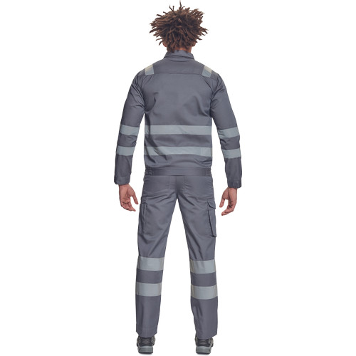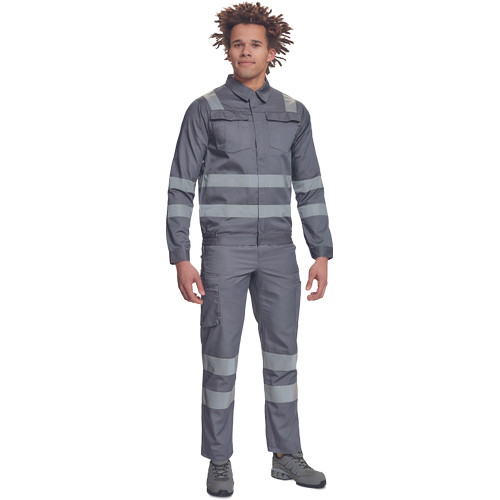 • férfi munkakabát 5 cm széles fényvisszavető csíkokkal • tépőzáras hajtókával fedett cipzár • 2 nagy zsebfedős mellzseb • rugalmas oldalsó betétek az alsó szegélyen • tépőzárral szűkíthető mandzsetták
