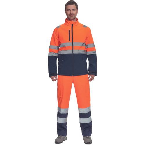 • Hi-Vis férfi softshell kabát TPU membránnal • 5cm vastag fényvisszavető csíkok az ujjakon és a testen • cipzáras • 1 mellkasi és 2 oldalsó zseb • tépőzárral szűkíthető ujjvégek, a pulóver alsó részén húzózsinór