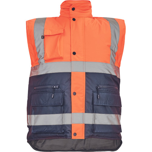 • Hi-Vis bélelt férfi mellény, gallérba rejtett kapucnival • 5 cm széles fényvisszavető csíkok • patentos hajtókával fedett cipzáras kialakítás • telefonzseb • 2 nagy zsebfedős első zseb és 2 cipzáras zseb