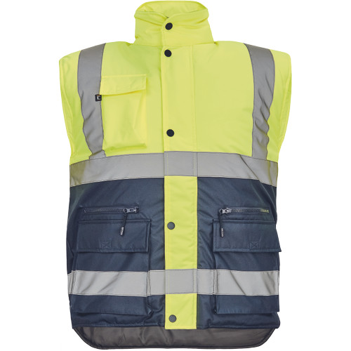 • Hi-Vis bélelt férfi mellény, gallérba rejtett kapucnival • 5 cm széles fényvisszavető csíkok • patentos hajtókával fedett cipzáras kialakítás • telefonzseb • 2 nagy zsebfedős első zseb és 2 cipzáras zseb