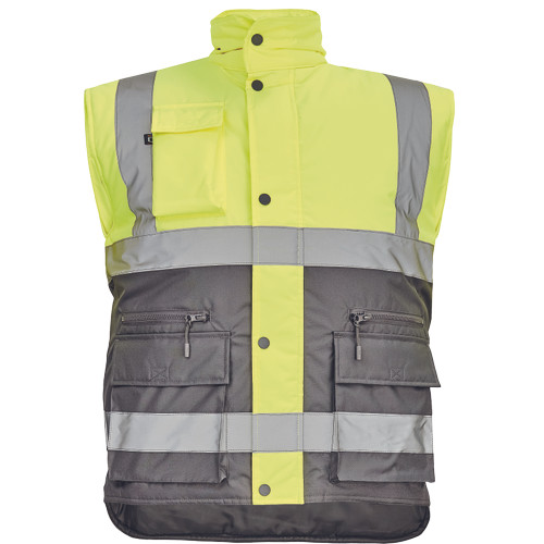 • Hi-Vis bélelt férfi mellény, gallérba rejtett kapucnival • 5 cm széles fényvisszavető csíkok • patentos hajtókával fedett cipzáras kialakítás • telefonzseb • 2 nagy zsebfedős első zseb és 2 cipzáras zseb