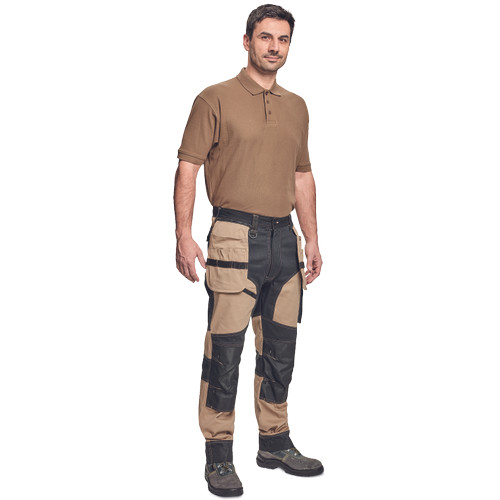 • férfi munkanadrág rugalmas derékkal • 2 oldalsó zseb, két szerszámtartó zsebbel elöl • D-gyűrű • 1 oldalsó zseb a lábon hajtókával • 1 oldalsó zseb cipzárral • 2 hátsó hajtókás zseb • megerősített térdrész, térdvédőtartó • 5 cm-rel meghosszabbítható nadrágszárak • a nadrág hátsó, alsó része megerősített • dekoratív varratok • 265 g/m2