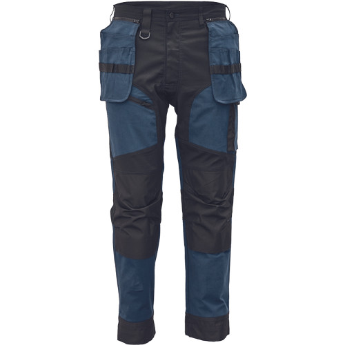 • férfi munkanadrág rugalmas derékkal • 2 oldalsó zseb, két szerszámtartó zsebbel elöl • D-gyűrű • 1 oldalsó zseb a lábon hajtókával • 1 oldalsó zseb cipzárral • 2 hátsó hajtókás zseb • megerősített térdrész, térdvédőtartó • 5 cm-rel meghosszabbítható nadrágszárak • a nadrág hátsó, alsó része megerősített • dekoratív varratok • 265 g/m2