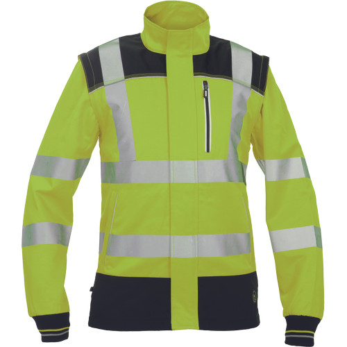 • jólláthatósági férfi dzseki levehető ujjakkal, cipzárral záródó kialakításban tépőzáras hajtókával • praktikus kialakítás 2 oldalzsebbel, elöl 1 zsebbel, a vállakon Oxford 600D anyagból készült megerősítő rátétekkel • a derékrészen, a vállakon és az ujjakon 5cm-es nyomtatott fényvisszavető csíkokkal van ellátva • kontrasztos színű tűzések