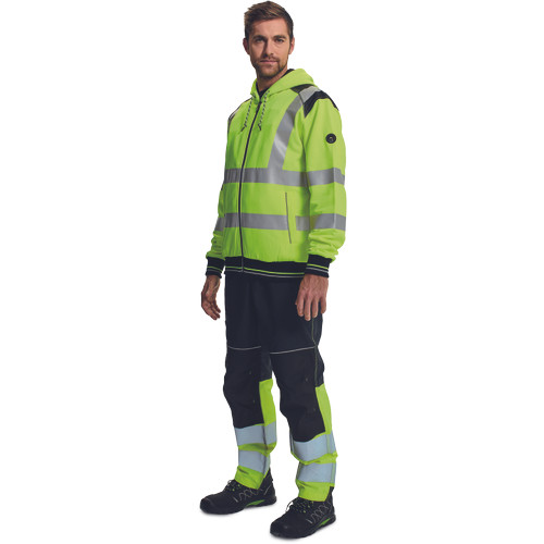 • kevertszálas, jólláthatósági kapucnis kardigán cipzárral • 2 db 5 cm-es szegmentált fényvisszavető csíkkal a derékrészen, az ujjakon és a vállakon • bolyhosodásmentes francia frottír szövet belső, kétrétegű kapucni, dekoratív tűzések • rugalmas mandzsetta és alsó szegély