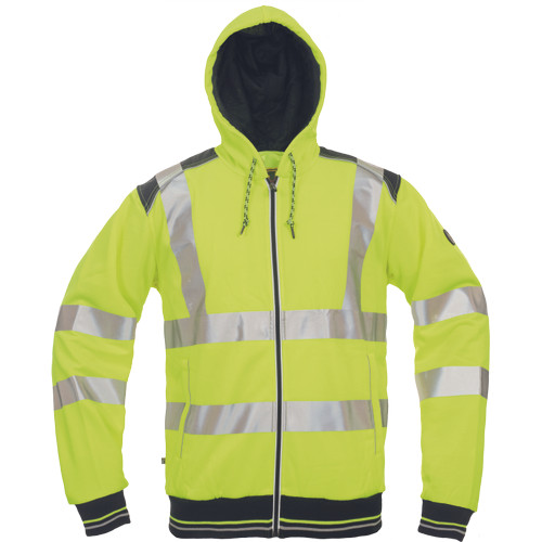 • kevertszálas, jólláthatósági kapucnis kardigán cipzárral • 2 db 5 cm-es szegmentált fényvisszavető csíkkal a derékrészen, az ujjakon és a vállakon • bolyhosodásmentes francia frottír szövet belső, kétrétegű kapucni, dekoratív tűzések • rugalmas mandzsetta és alsó szegély