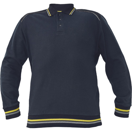 • pamut - PES kevertszálas férfi pulóver • puha francia frottír belső • kontrasztos fekete vállrész, fényvisszavető szegéllyel • 3 gombos nyakkivágás, kontrasztos csíkok a galléron