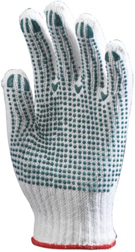 * Négy szálas, 10-es kötésű poliészter/pamut védőkesztyű* Tenyéren csúszás elleni pöttyözés* Gumírozott mandzsetta