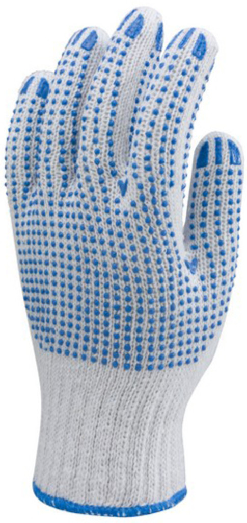 Fehér, pamutból és poliészterből készült, varrás nélküli kesztyű piros vagy kék PVC pöttyökel a tenyéren és a kézháton; 4350: piros / 4355 kék: 2 fonallal kötött, 78 grammos ; kötött mandzsettával