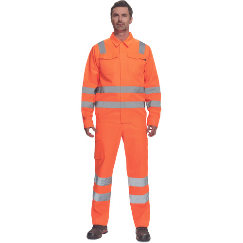 • férfi Hi-Vis kabát 5 cm széles fényvisszavető csíkokkal • cipzáras, tépőzáras hajtókával • 2 nagy hajtókás mellkasi zseb • rugalmas oldalsó betétek a kabát alján • tépőzáras mandzsetta