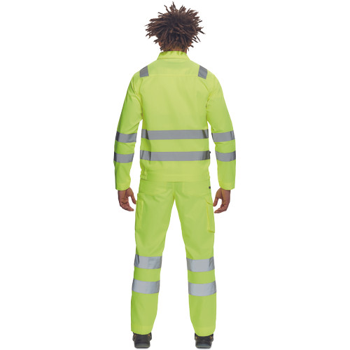 • férfi Hi-Vis kabát 5 cm széles fényvisszavető csíkokkal • cipzáras, tépőzáras hajtókával • 2 nagy hajtókás mellkasi zseb • rugalmas oldalsó betétek a kabát alján • tépőzáras mandzsetta