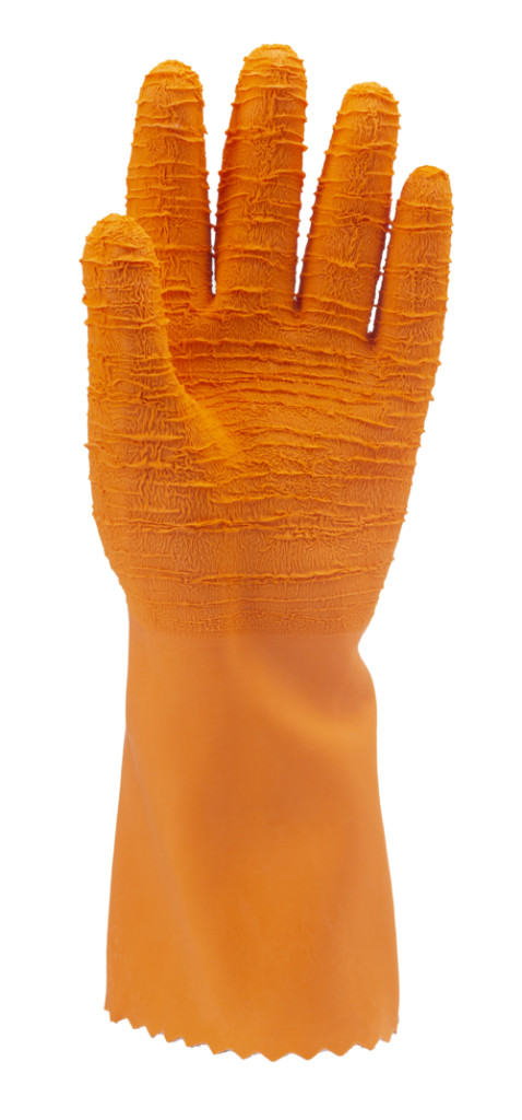 Pamutra mártott, saválló narancs krepp latex védőkesztyű34 cm hosszú, csuklóban szűkített kialakítás1,8 mm vastag, megerősített csúszás elleni érdesítés