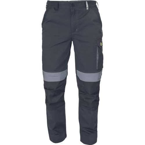 • férfi munkanadrág rugalmas derékpánttal • 2 oldalzseb • 1 bal combzseb • 2 hátsó zseb tépőzárral • térdrész erősítés opcionálisan behelyezhető térdpárnával • fényvisszavető részletek • állítható szárhossz