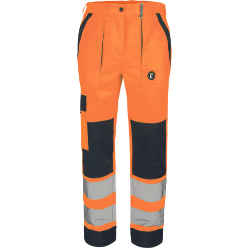 • női HI-VIS munkanadrág rugalmas derékrésszel • 2 oldalzseb • 1 combzseb • 2 hátulsó zseb tépőzárral • 2 bevarrt, 7,5 cm széles fényvisszavető csík a lábszáron • megerősített térdrész • hosszabbítható szárhossz