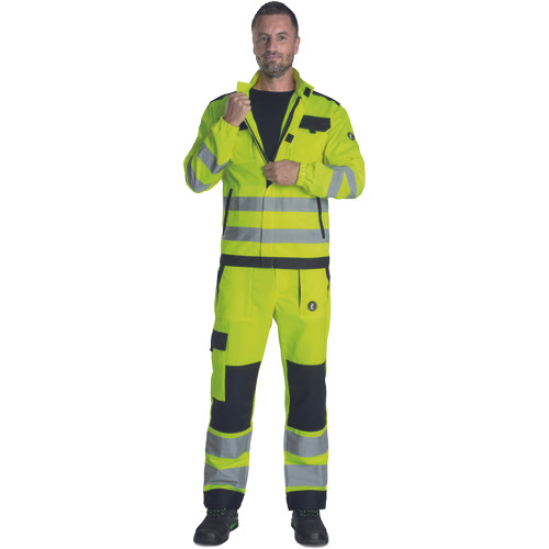 • Unisex HI-VIS munkakabát cipzárral, takarólappal ellátva • 2 oldalzseb • 2 mellzseb tépőzárral • 2 bevarrt, 5 cm széles fényvisszavető csík az oldalak mentén és az alsó ujjrészeken • megerősített vállrészek • rugalmas mandzsetták és elasztikus derékrész.