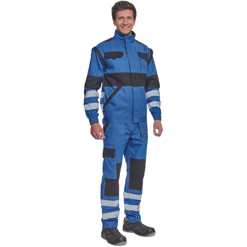• férfi cipzáras munkakabát levehető újakkal • 2 első zseb • 2 mellzseb • megerősítés a váll és könyök részeken • rugalmas mandzsetta és alsó derékszegély • fényvisszavető csíkok az ujjakon és a kabát hátán, anyag: 100% pamut, anyagvastagság: 260 g/m2